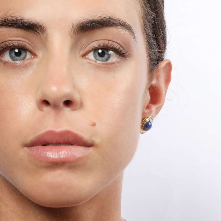Orecchini realizzati interamente a mano in oro giallo 18 carati con2 lapis cabochon 8 mm e 2 lapis cabochon 9 mm.