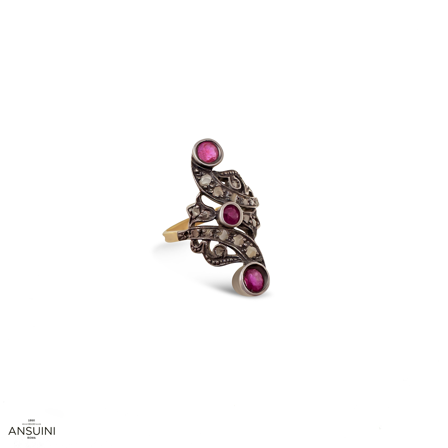 Anello di fine 800 in oro e argento con rubini e diamanti.
